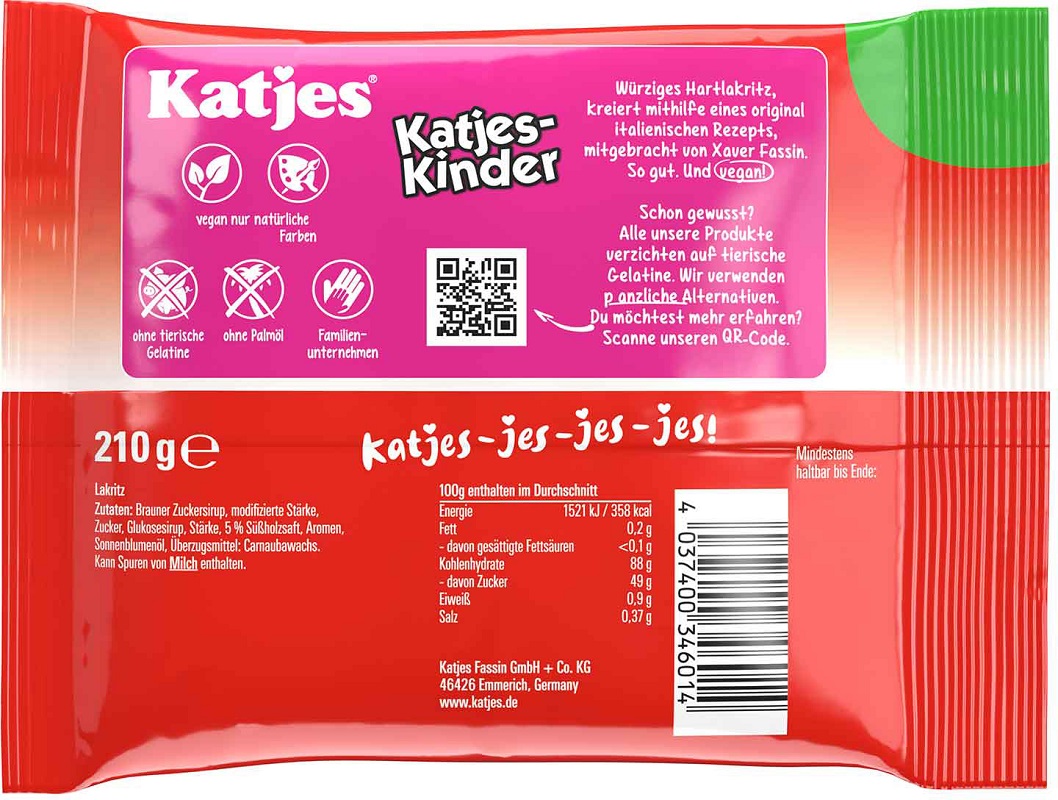 Katjes Katjes-Kinder, würiges Hartlakritz mit cremigem Aroma. Für Veganer geeign