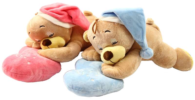 Schlafbär auf Herzkissen mit Mütze, liegend ca. 40cm, 2-fach sort.