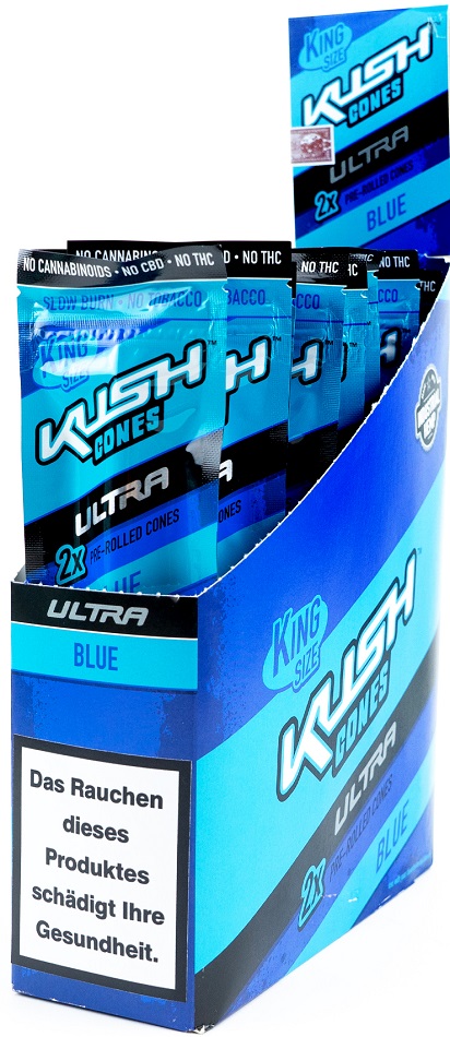 Cones Kush Ultra Herbal BLUE (Berries) Preroled Hanf Cones vorgedrehte Joint-Hüllen 2er Pack (15x 2 Cones) ca. 105mm mit Filter im 15er T-Dsp.