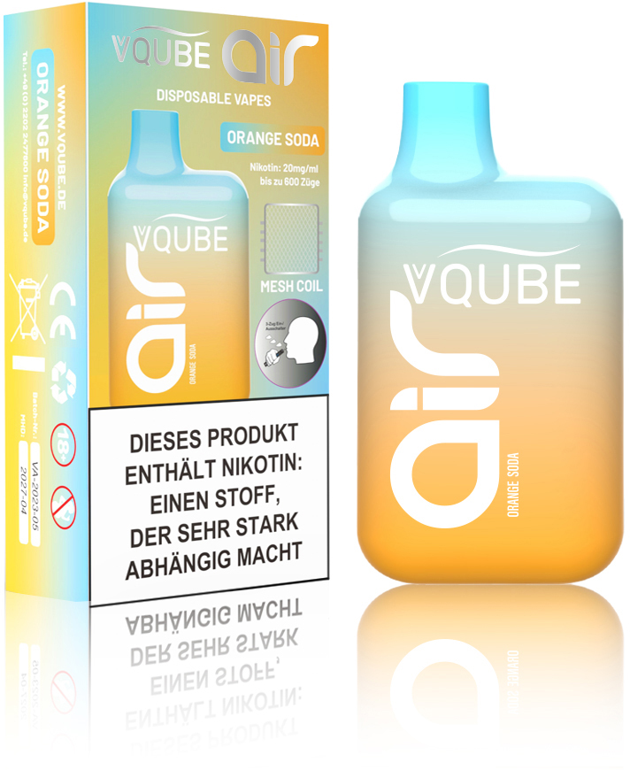 VQUBE AIR E-Shisha ORANGE SODA - Nikotin 2ml Liquid Nic-Salt 20mg/ml ca. 600 Züge 500mAh Einweg-Pod System TPD konform 10er T-Dsp.(mit Steuerbanderole)